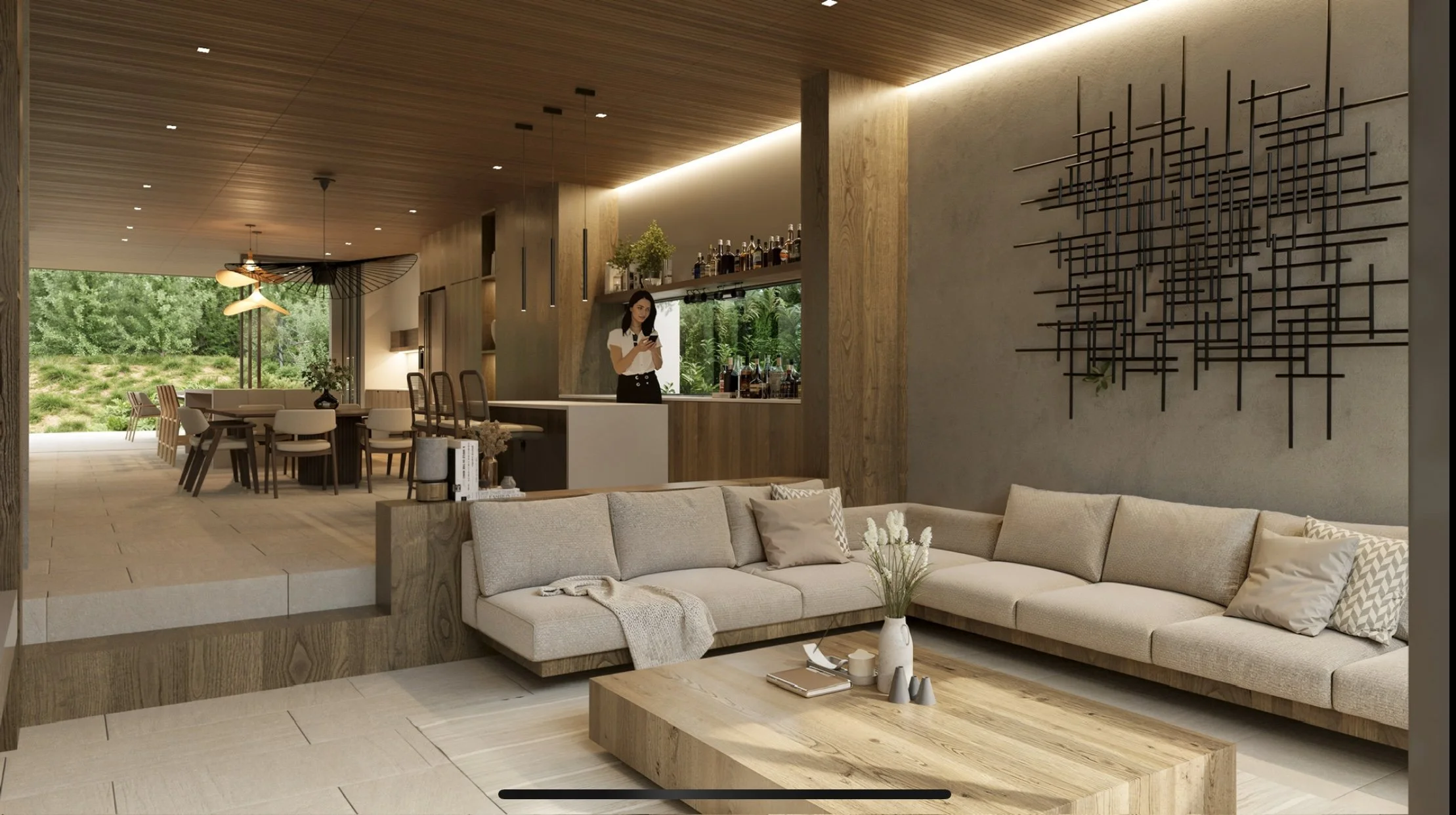Intentional zoning was key to this build. Pourya created a soundproofed corridor that separates living spaces from the sleeping quarters, offering both privacy and peace. Each bedroom is freestanding and detached from the others, with a 4-meter garden space between them, ensuring natural light, airflow, and a feeling of openness. A large glass wall connects the interior living room with an expansive rancho hangout area, seamlessly blending indoor comfort with outdoor entertainment.