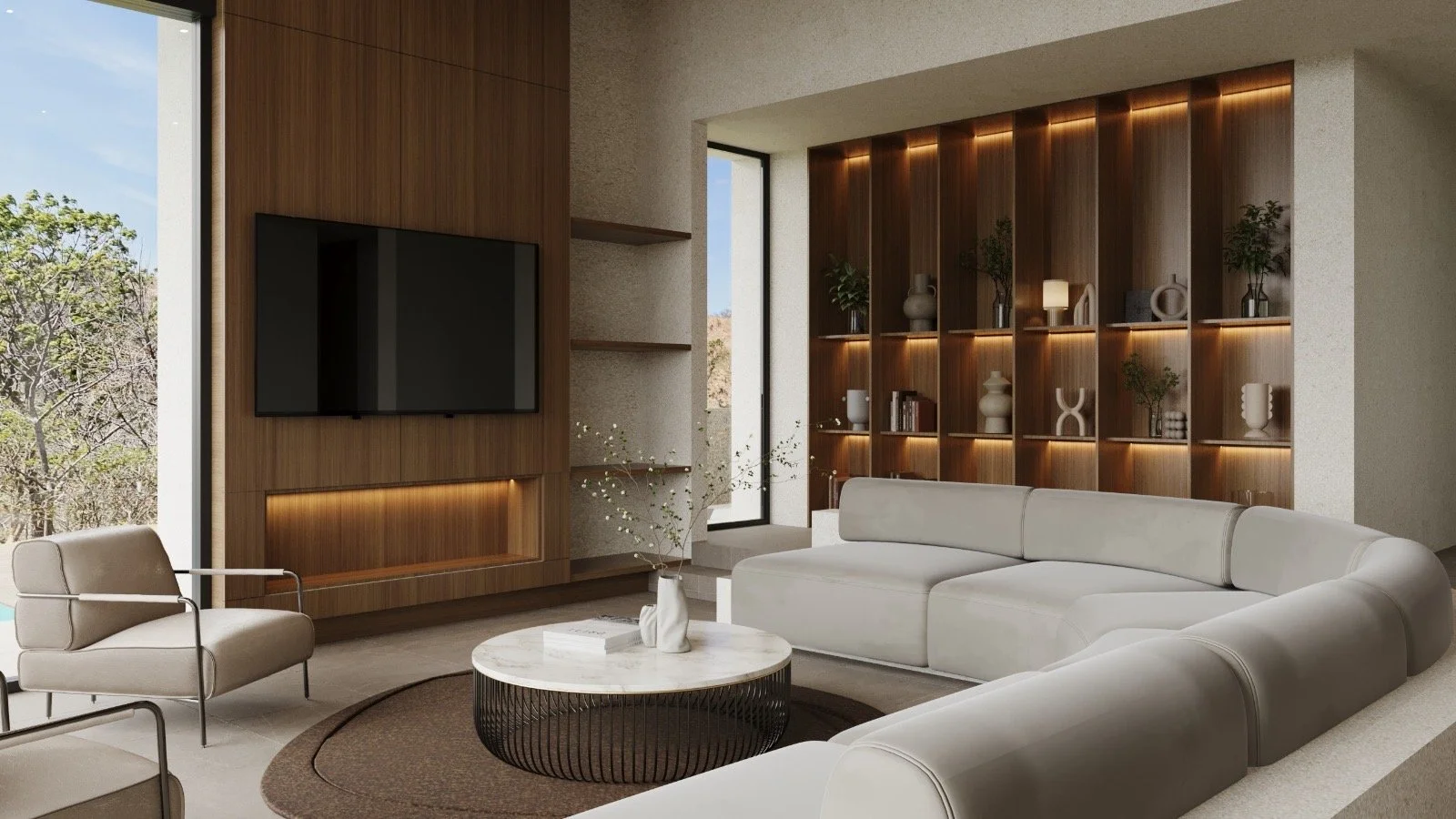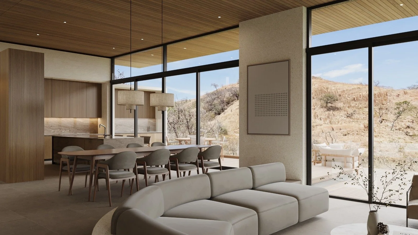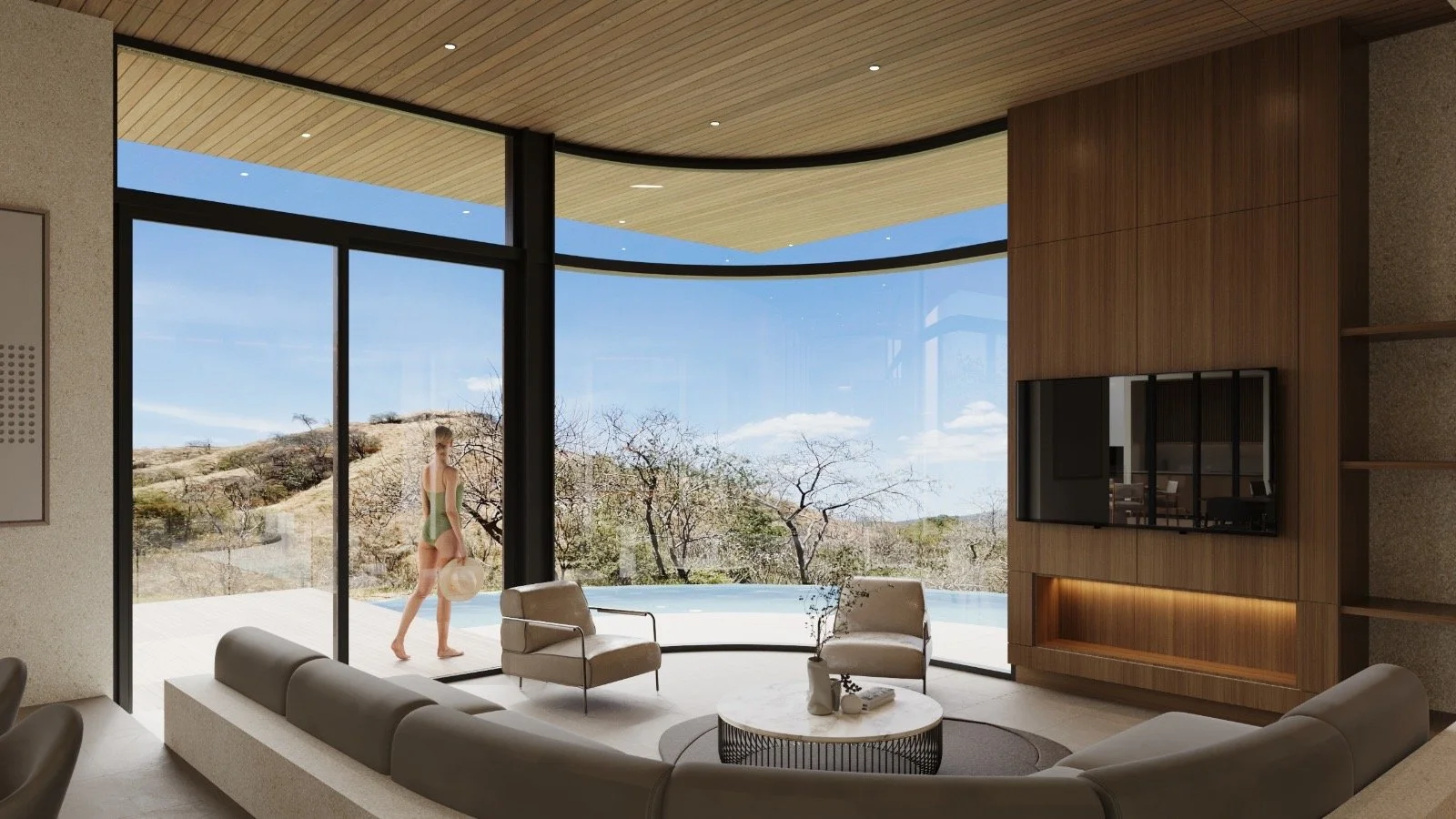 The design follows the natural curve of the mountain, inspiring features such as a curved pool edge and a sweeping floor-to-ceiling curved windows off the main living area. To enhance spatial experience, a sunken living room was created, adding depth and distinction to the interiors. High ceilings and expansive windows invite natural light and mountain breezes, while earth tones and organic finishes ground the home in its surroundings. Outdoor elements like terraces, an outdoor shower, and open spaces ensure that daily living is fully immersed in the landscape.